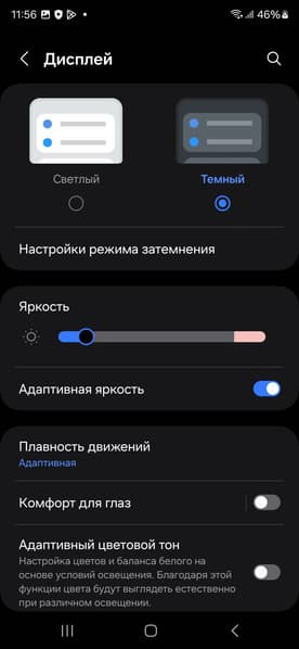 При выводе белого поля во весь экран и при ручном управлении яркостью ее максимальное значение составило порядка 680 кд/м² в обычных условиях (и если включить режим повышенной яркости, без него — 390 кд/м²), но на очень ярком свету и в случай автоматической регулировки яркости оно повышается до 1270 кд/м² (в режиме HDR, то есть для HDR‑контента, максимальная яркость для белого поля почти во весь экран такая же). Также нужно учитывать тот факт, что в данном случае чем меньше площадь белого на экране, тем он светлее, то есть фактическая максимальная яркость белых участков будет почти всегда выше указанного значения. В итоге, учитывая великолепные антибликовые свойства, читаемость экрана днем на солнце должна быть на отличном уровне, а темная тема не только экономит заряд аккумулятора, но способствует лучшей разборчивости информации на экране в условиях высокой освещенности. Минимальное значение яркости — 0,9 кд/м², то есть пониженный уровень яркости без проблем позволяет использовать устройство даже в полной темноте. Работает автоматическая регулировка яркости по датчику освещенности (он расположен под экраном близко к верхнему краю ниже фронтальной камеры). Работа этой функции зависит от положения ползунка регулировки яркости: им пользователь может попытаться выставить желаемый уровень яркости в текущих условиях. Если оставить все по умолчанию, то в полной темноте функция автояркости уменьшает яркость до 10 кд/м² (подходит), в условиях освещенного искусственным светом офиса (примерно 550 лк) устанавливает на 90 кд/м² (нормально), а условно под прямыми лучами солнца повышает до 1270 кд/м² (до максимума, так и нужно). Результат нас устроил, но для пробы в полной темноте мы снизили яркость, получив в итоге для трех условий, указанных выше, следующие значения: 2, 100 и 1270 кд/м² (что и требовалось). Получается, что функция автоподстройки яркости работает адекватно и в какой-то степени позволяет пользователю настраивать свою работу под индивидуальные требования.