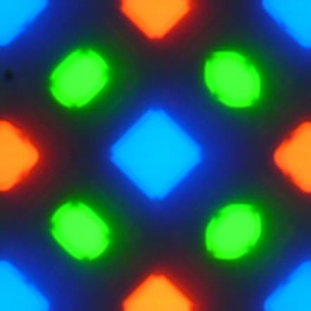 В этом экране используется матрица AMOLED — активная матрица на органических светодиодах. Полноцветное изображение создается с помощью субпикселей трех цветов — красного (R), зеленого (G) и синего (B), но красных и синих субпикселей в два раза меньше, что можно обозначить как RGBG. Это подтверждается фрагментом микрофотографии: