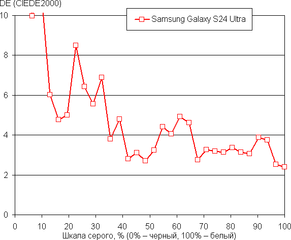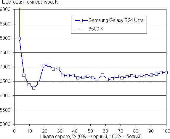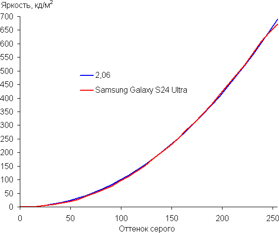 Напомним, что в случае OLED-экранов яркость фрагментов изображения динамично меняется в соответствии с характером выводимого изображения — чуть уменьшается для светлых в целом изображений. В итоге полученная зависимость яркости от оттенка (гамма-кривая), скорее всего, не соответствует гамма-кривой статичного изображения, так как измерения проводились при последовательном выводе оттенков серого почти на весь экран.
