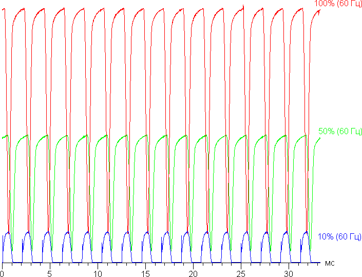 Видно, что на высокой и средней яркости амплитуда модуляции довольно большая, но скважность низкая, в итоге видимого мерцания нет. Однако при сильном понижении яркости появляется модуляция с большой относительной амплитудой и высокой скважностью, ее наличие уже можно увидеть в тесте на присутствие стробоскопического эффекта или просто при быстром движении глаз. В зависимости от индивидуальной чувствительности такое мерцание может вызывать повышенную утомляемость. Впрочем, фаза модуляции различается по площади экрана, а частота довольно высокая, поэтому негативный эффект от мерцания снижен.