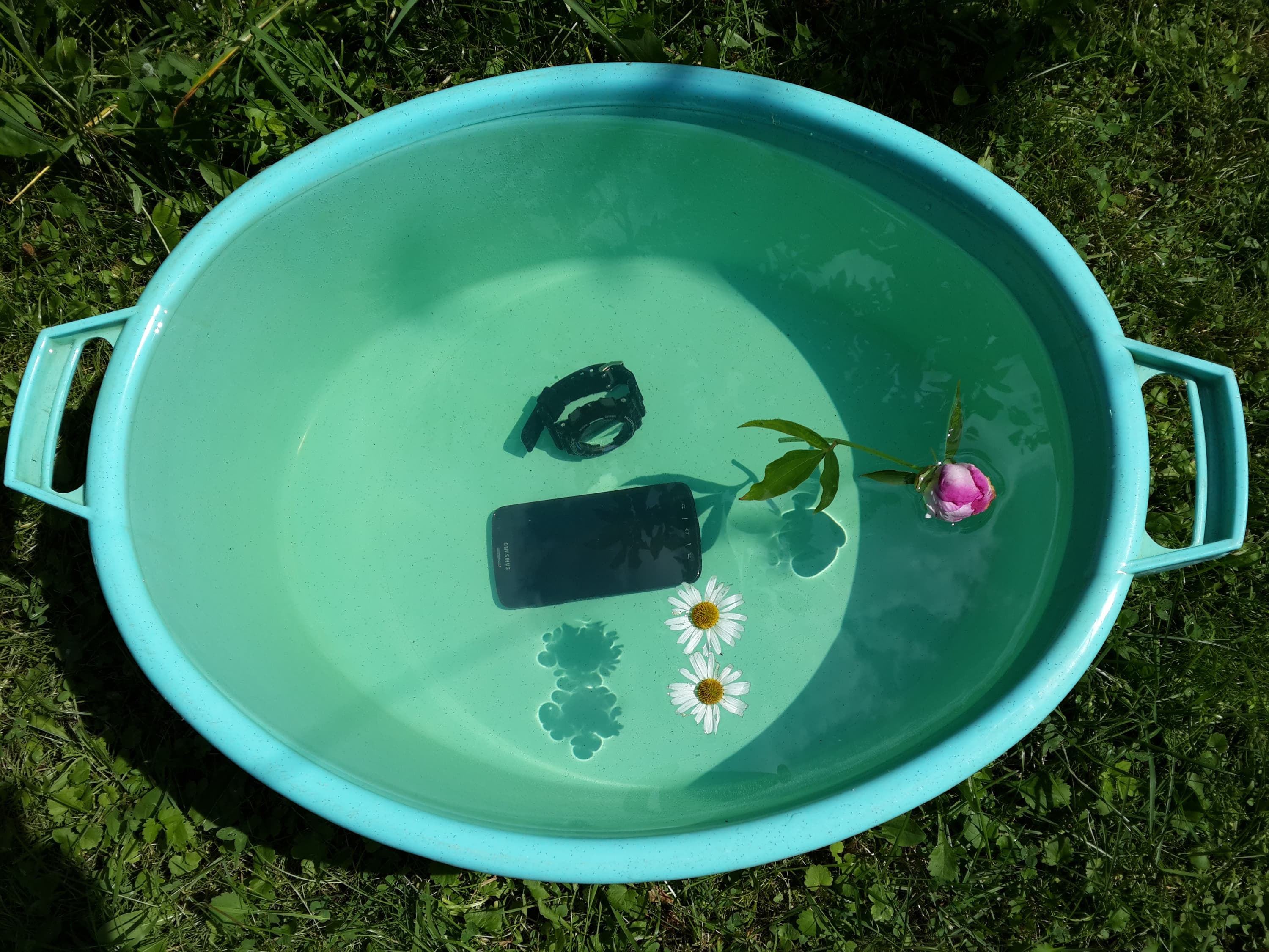 К сожалению, присланный к нам в редакцию экземпляр Samsung Galaxy S4 Active оказался на поверку вовсе не финальным, а всего лишь предрелизным демонстрационным образцом, не предназначенным для настоящего тестирования его свойств защиты. Однако мы узнали об этом гораздо позже — уже после того, как хорошенько «искупали» нашего подопечного в тазу. На этот раз проверка была тем более актуальна, потому что у аппарата среди прочих возможностей заявлен режим подводной съемки — уникальный режим «Вода», при котором управление камерой автоматически переключается на клавишу громкости: ведь под водой сенсорный экран становится нечувствителен к прикосновениям.