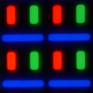 В этом смартфоне используется матрица Super AMOLED — активная матрица на органических светодиодах. Полноцветное изображение создается с помощью субпикселей трех цветов — красного, зеленого и синего в равном количестве, что подтверждается фрагментом микрофотографии: