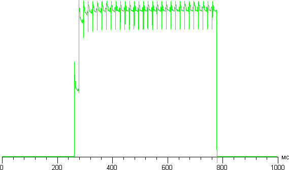 Переключение состояния элементов матрицы выполняется практически мгновенно, но на фронте включения (и реже выключения) может присутствовать ступенька (или две) шириной 16,7 мс (соответствует частоте обновления экрана в 60 Гц). Например, так выглядит зависимость яркости (вертикальная ось) от времени при переходе от черного к белому и обратно: