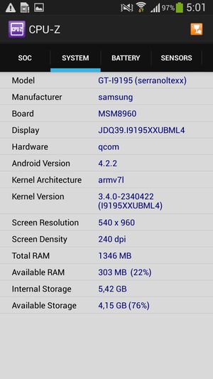 Аппаратная платформа Samsung Galaxy S4 mini Black Edition строится на базе однокристальной системы (SoC) Qualcomm Snapdragon 400 (MSM8960). Центральный процессор здесь имеет 2 ядра Krait 300, работающих на частоте 1,7 ГГц. Оперативной памяти в устройстве предусмотрено 1,5 ГБ, а хранилище, доступное пользователю для загрузки собственных файлов, составляет всего около 5 ГБ из номинально обозначенных 8 ГБ — остальное ушло на саму систему и приложения. Память можно нарастить за счет карточек microSD объемом до 64 ГБ, а вот подключить флэш-накопитель через OTG-переходник здесь не получится — аппарат данный режим не поддерживает.