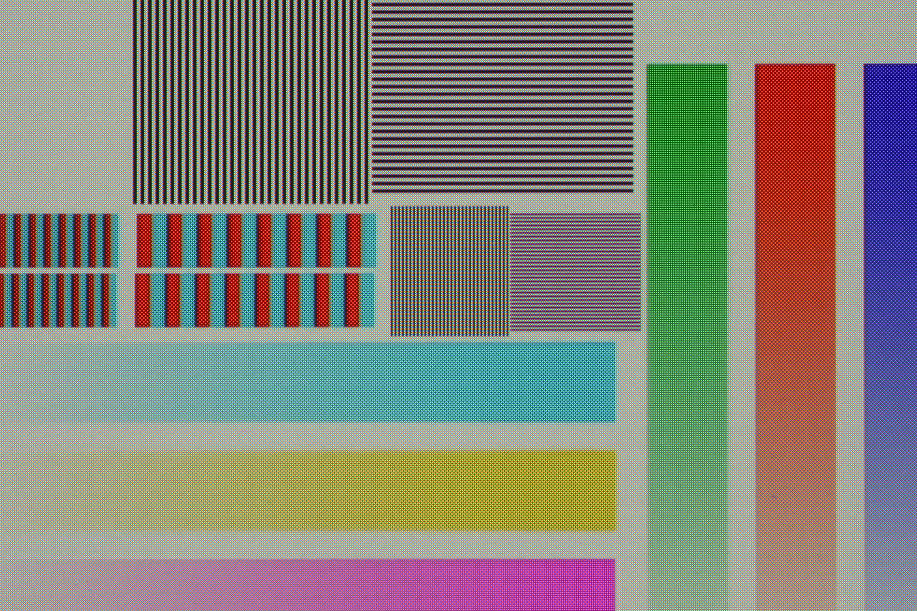 Для таких матриц компания Samsung ввела наименование PenTile RGBG. Разрешение экрана производитель считает по зеленым субпикселям, по двум другим оно будет в два раз ниже. Расположение и форма субпикселей в этом варианте аналогична варианту в случае экрана Samsung Galaxy S4. Такой вариант PenTile RGBG лучше, чем старый с квадратиками красных, прямоугольниками синих и полосками зеленых субпикселей. Тем не менее, некоторая неровность контрастных границ и другие артефакты все равно присутствуют. Например, при выводе черно-белой миры через один пиксель (оригинал можно взять отсюда) вертикальные линии выглядят неровными, а горизонтальные неконтрастные и разделены не белым, а зеленоватым промежутком. Фрагмент (по ссылке доступна исходная фотография) макрофотографии выявляет причину: