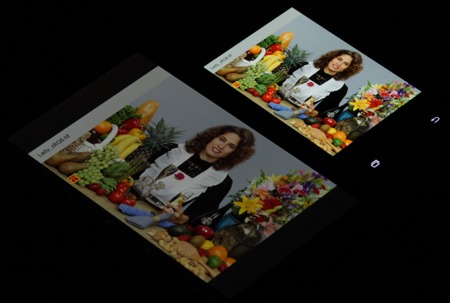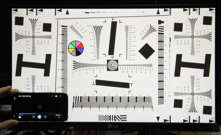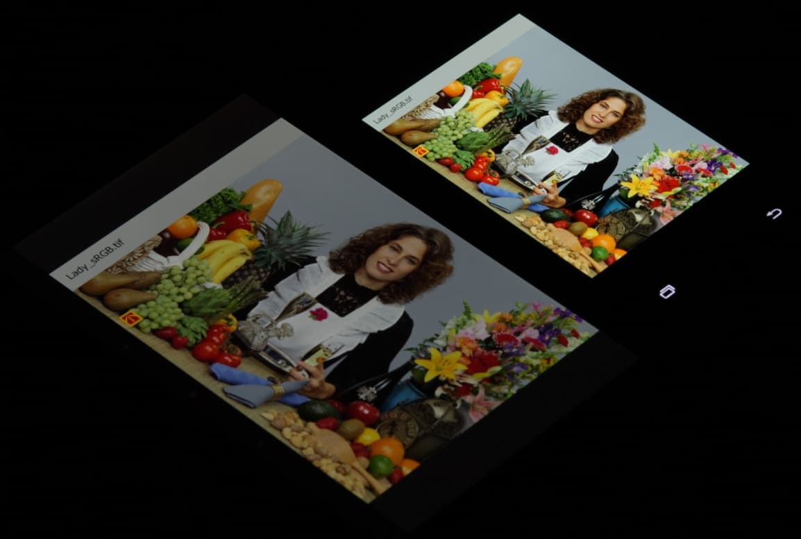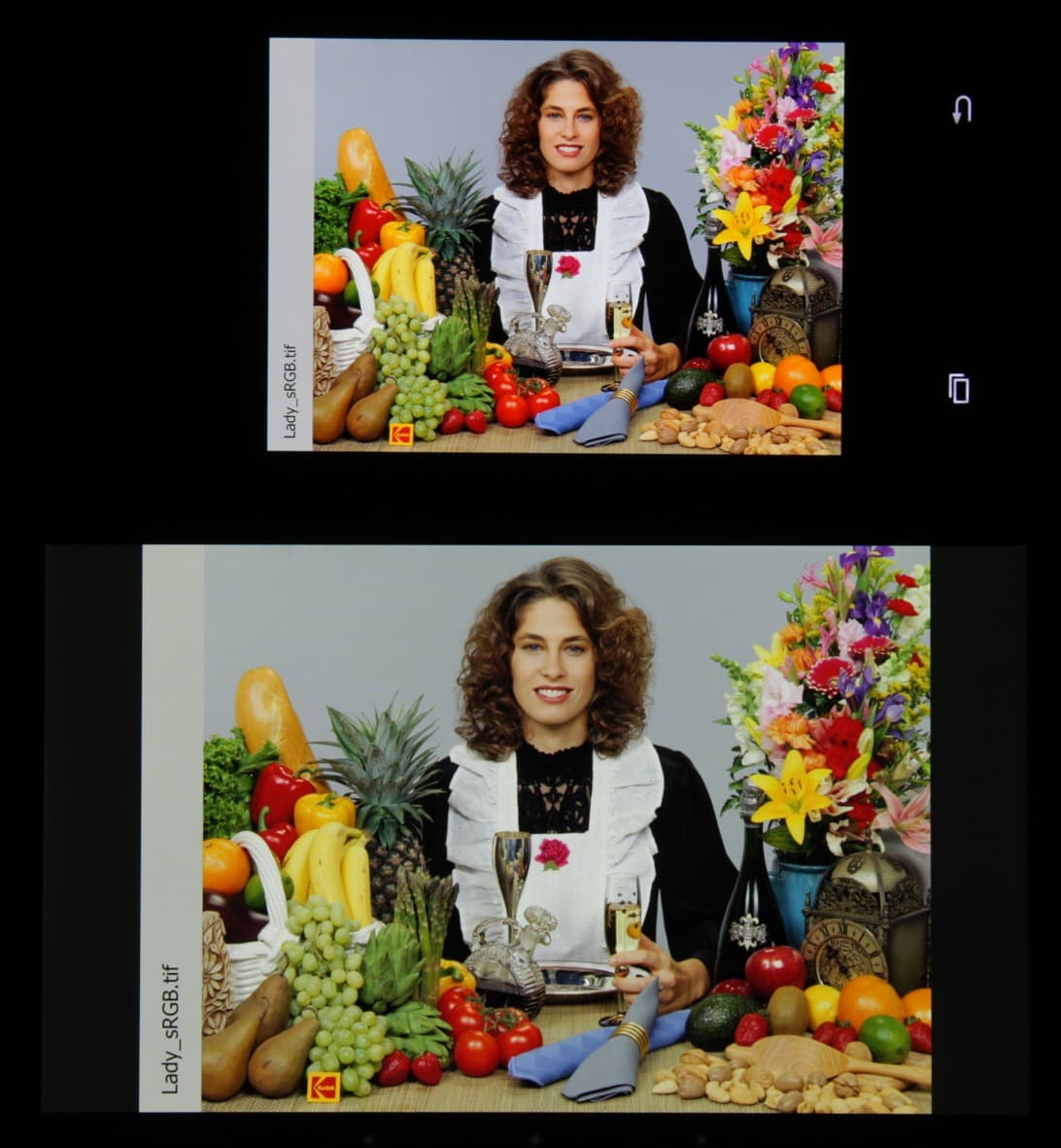 Яркость под углом у обоих экранов заметно уменьшилась (чтобы избежать сильного затемнения, выдержка увеличена в два раза в сравнении с предыдущими двумя фотографиями), но в случае Samsung падение яркости выражено гораздо меньше. И тестовая картинка: