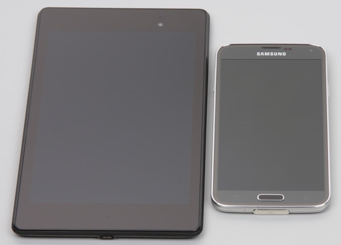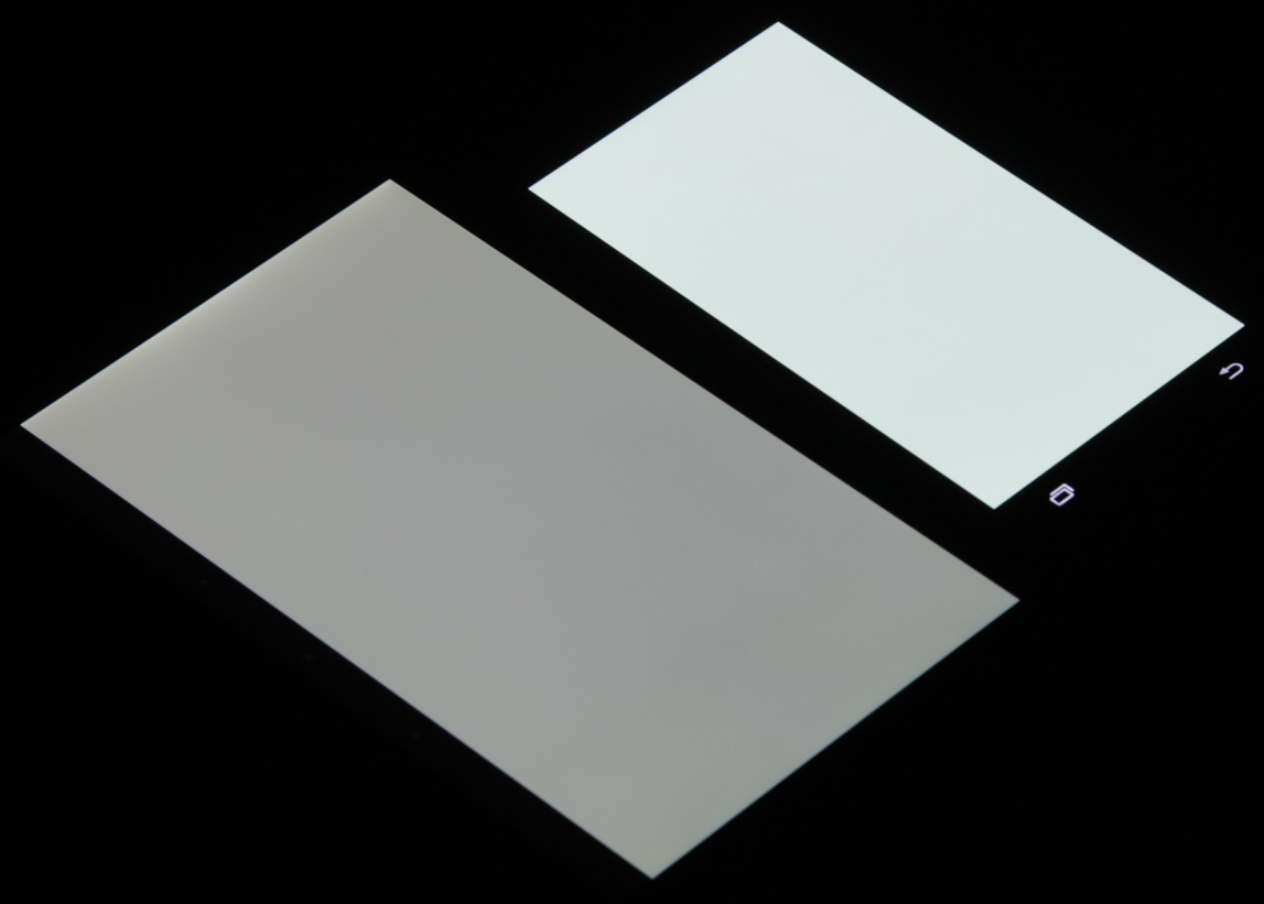 Лицевая поверхность экрана выполнена в виде стеклянной пластины с зеркально-гладкой поверхностью, устойчивой к появлению царапин. Судя по яркости отраженных объектов, имеется очень эффективный антибликовый фильтр, превосходящий по снижению яркости отражения фильтр экрана Google Nexus 7 (2013) (далее просто Nexus 7). Для наглядности приведем фотографию, на которой в выключенных экранах отражается белая поверхность (слева — Nexus 7, справа — Samsung Galaxy S5, далее их можно различать по размеру):