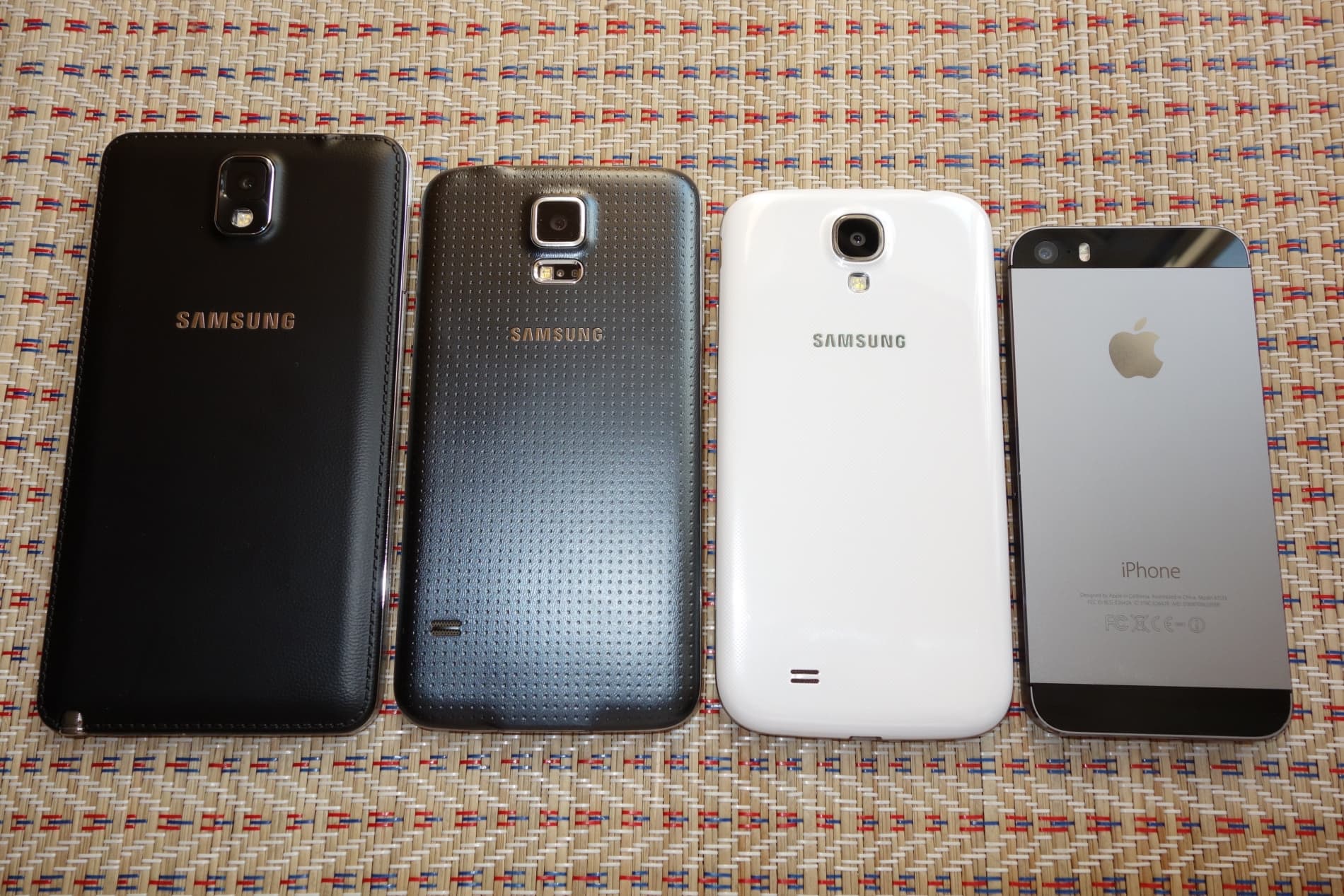 Слева направо: Samsung Galaxy Note 3, Galaxy S5, Galaxy S4, Apple iPhone 5s