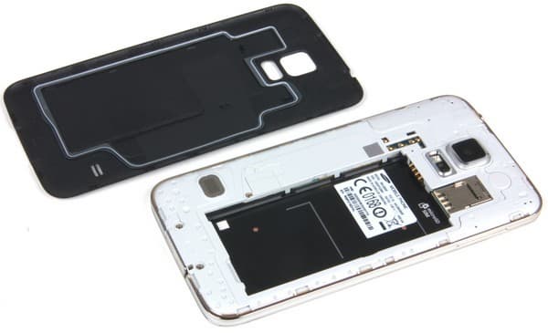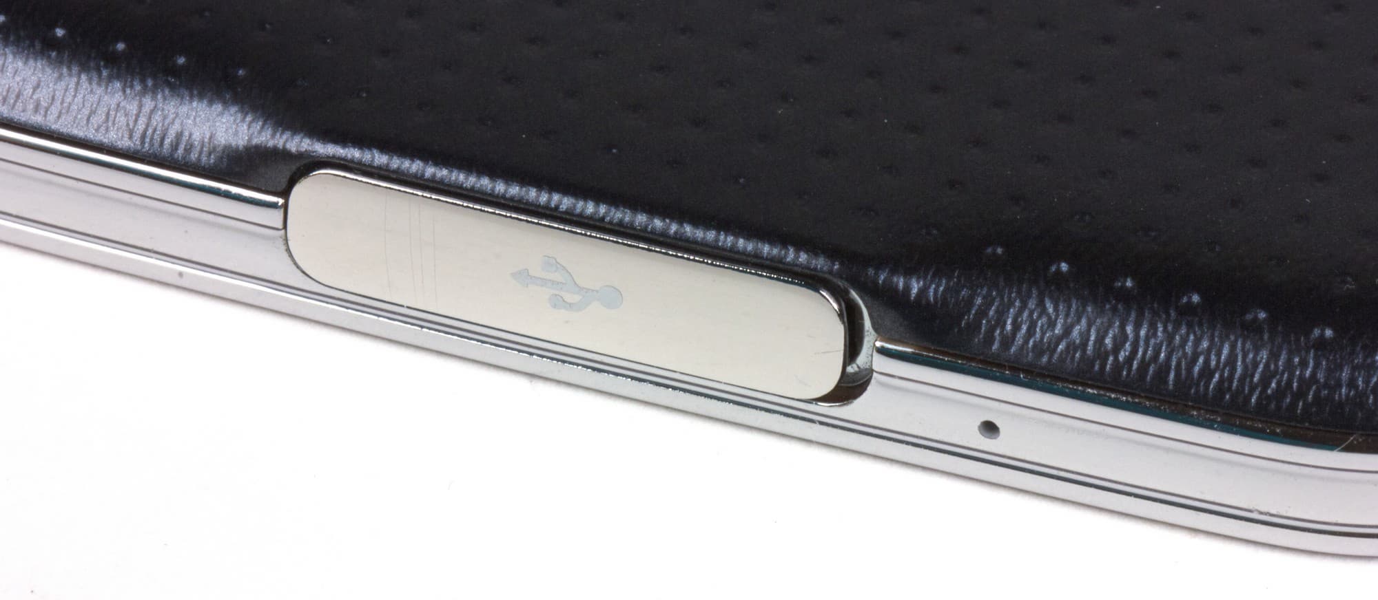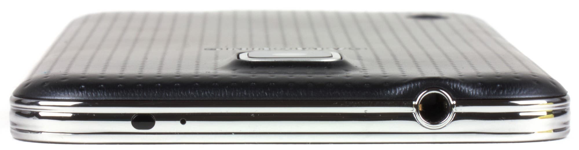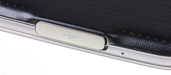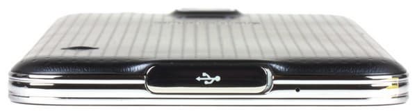 На нижнем торце разъем USB 3.0 прикрыт металлизированной крышкой с резиновой прокладкой — она защищает смартфон от попадания внутрь пыли и влаги. Да-да, новый флагман линейки Galaxy S наконец-то обзавелся пылевлагозащитой по стандарту IP67. В принципе, имелась она и у предыдущей модели, но там это было отдельное ответвление линейки под названием Galaxy Active. Защита в аппарате Galaxy S5 устроена так же, как там: к внутренней поверхности задней крышки приклеили резиновую проладку, а разъемы закрываются специальными заглушками. Приятно, что каждый раз, когда надевается задняя крышка или вынимается штекер из разъема Micro-USB, смартфон сам напоминает о необходимости закрыть защитные крышки (напоминание можно отключить).