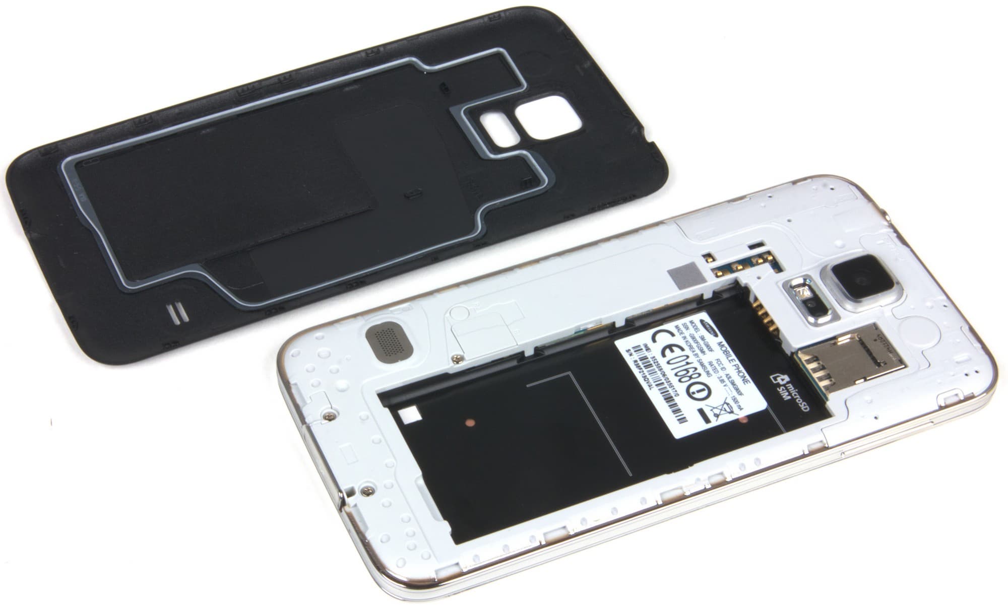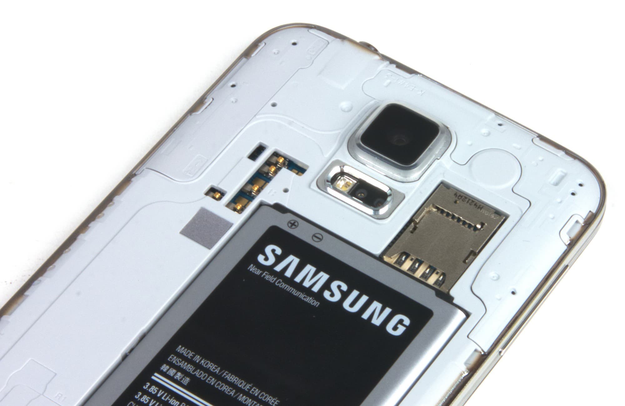Ниже обустроили отсек для съемной аккумуляторной батареи — она подпирает карточки, но карту памяти все-таки можно заменить «на горячую». SIM-карта в аппарате используется только одна, формата Micro-SIM, карту памяти microSD здесь можно использовать объемом до 128 ГБ.