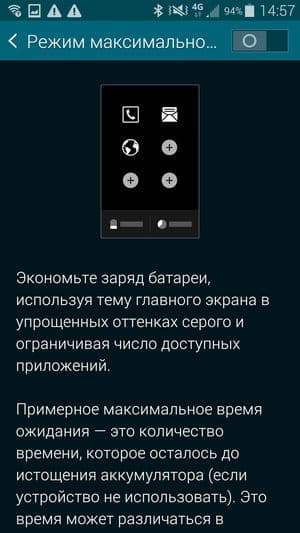 В смартфон добавлен еще один специфический режим работы, про который на презентациях много говорили сами разработчики. По сути, это обычный энергосберегающий режим, который есть у любой встроенной программы для экономии энергии в мобильных устройствах, просто Samsung доводит в этом режиме свой смартфон совсем уж до полного «истощения». При задействовании режима максимального энергосбережения не только отключаются все сетевые интерфейсы, но еще и графический интерфейс оболочки становится черно-белым, а количество допущенных к работе приложений жестко ограничивается. Естественно, в таком режиме смартфон может «проработать» гораздо дольше (кто бы сомневался), однако работа эта будет вестись в весьма ограниченных рамках.