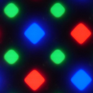 В этом смартфоне используется матрица Super AMOLED — активная матрица на органических светодиодах. Полноцветное изображение создается с помощью субпикселей трех цветов — красного (R), зеленого (G) и синего (B), но зеленых субпикселей в два раза больше, что можно обозначить как RGBG. Это подтверждается фрагментом микрофотографии: