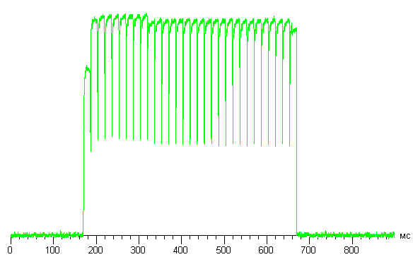 Переключение состояния элементов матрицы выполняется практически мгновенно, но на фронте включения (и реже выключения) может присутствовать ступенька (или две) шириной 16,7 мс (соответствует частоте обновления экрана в 60 Гц). Например, так выглядит зависимость яркости от времени при переходе от черного к оттенку 25% (по численному значению цвета) и обратно: