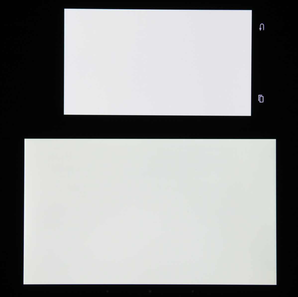 Экран характеризуется великолепными углами обзора, правда белый цвет при отклонении на относительно большие углы приобретает легкий оттенок, но черный цвет — просто черный под любыми углами (хотя отражение от ярких объектов имеет синеватый ореол больше вытянутый по горизонтали, из-за чего на свету черные участки могут слегка высветляться приобретать «металлический» оттенок). Настолько черный, что параметр контрастности в данном случае просто неприменим. При перпендикулярном взгляде равномерность белого поля отличная. Для сравнения приведем фотографии, на которых на экраны Samsung Galaxy S5 и второго участника соревнования выведены одинаковые изображения, при этом яркость экранов установлена примерно на 210 кд/м². Перпендикулярно к экранам белое поле: