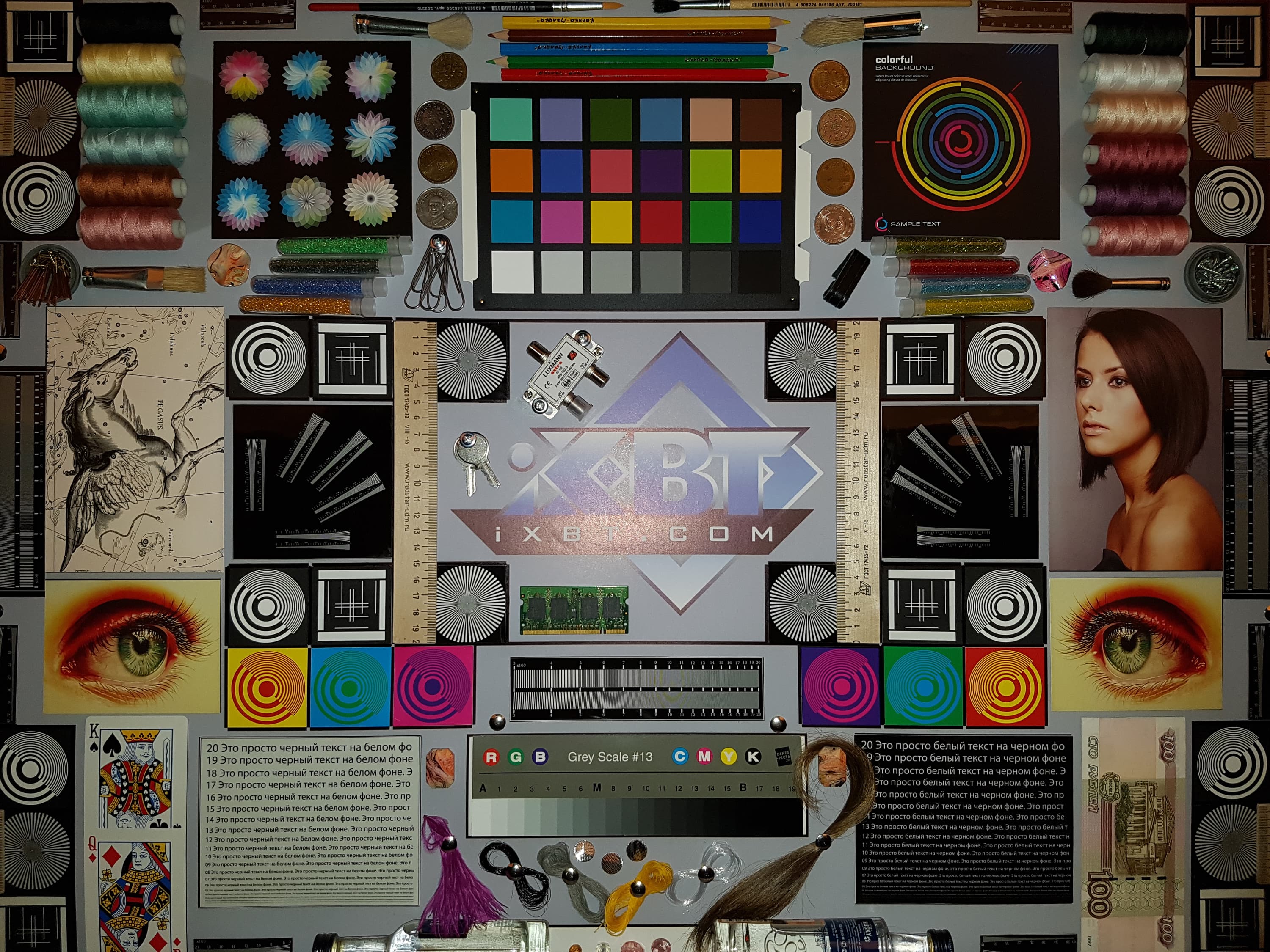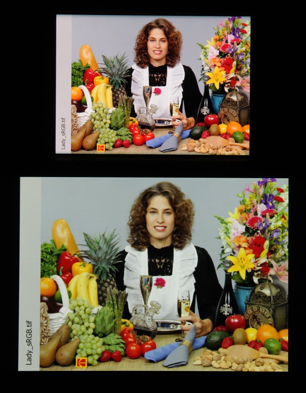 Отметим отличную равномерность яркости и цветового тона белого поля (за исключением затемнения и изменения оттенка к загнутым краям). И тестовая картинка (профиль Основной):
