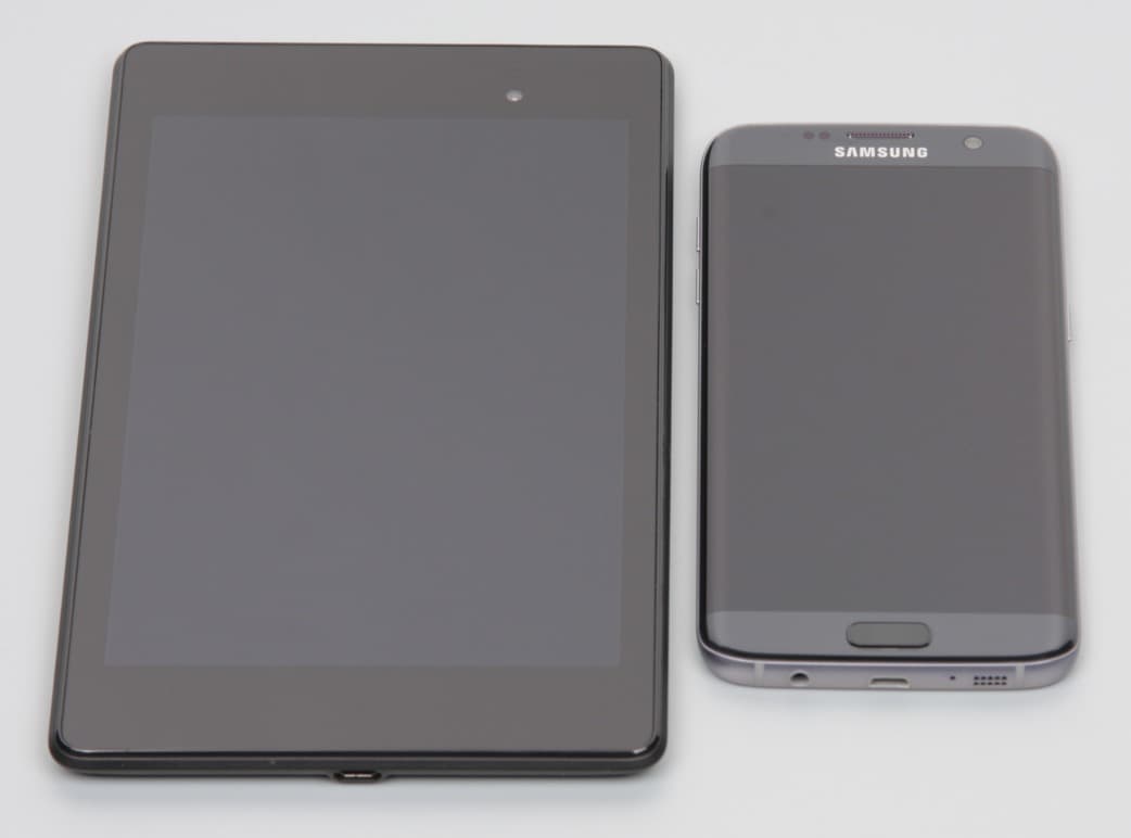 Лицевая поверхность экрана выполнена в виде стеклянной пластины с зеркально-гладкой поверхностью, устойчивой к появлению царапин. Судя по отражению объектов, антибликовые свойства экрана не хуже, чем у экрана Google Nexus 7 (2013) (далее просто Nexus 7). Для наглядности приведем фотографию, на которой в выключенных экранах отражается белая поверхность (слева — Nexus 7, справа — Samsung Galaxy S7 Edge, далее их можно различать по размеру):