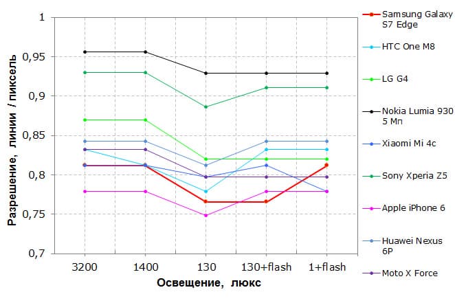 Как видно из графика, по разрешающей способности камера практически на уровне своих предшественников, однако общее качество снимков несомненно возросло, хоть и ненамного.