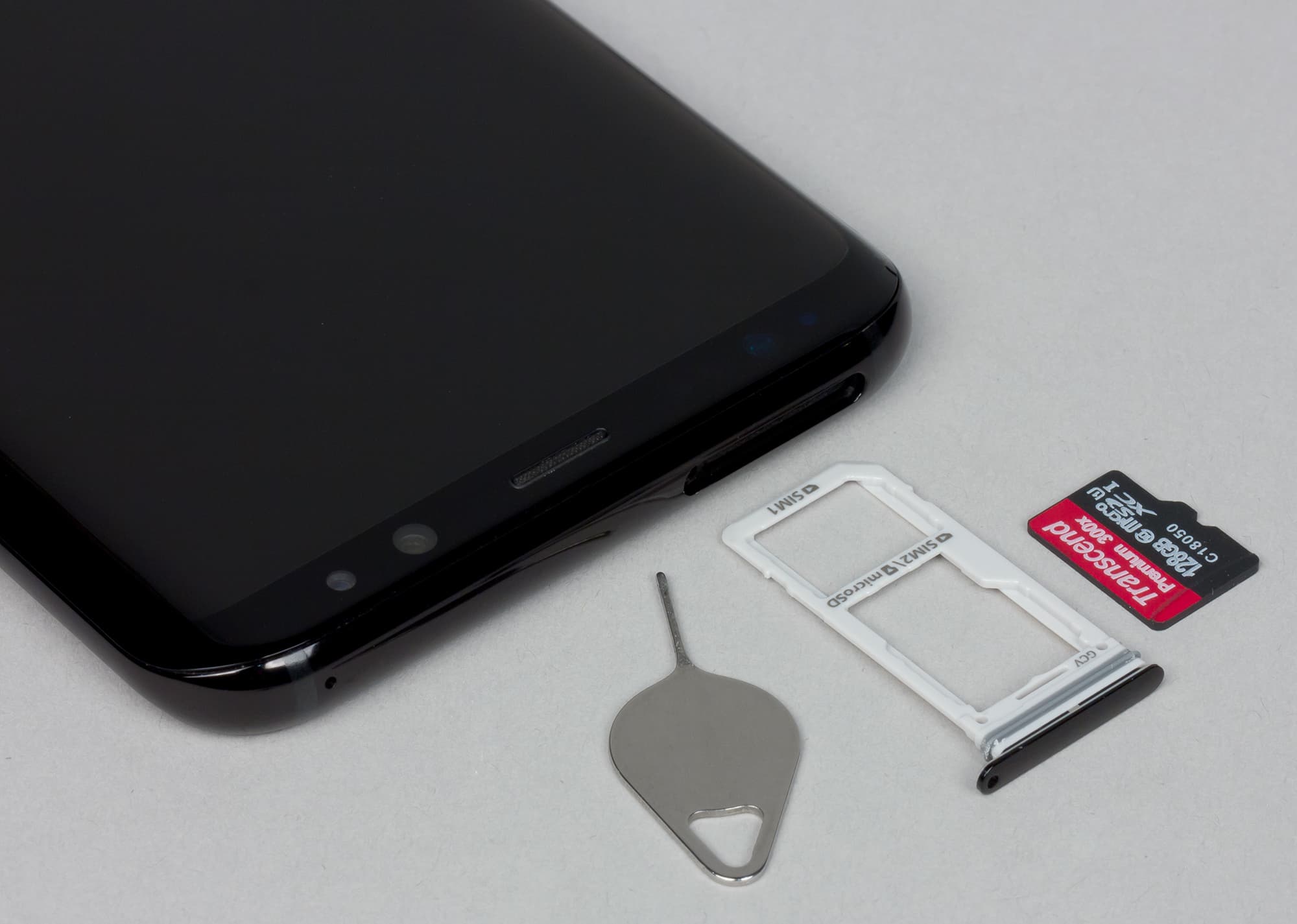 Разъем для установки карточек вынесен на верхний торец. Крышка съемных салазок, на которые укладываются карточки, имеет прорезиненную прокладку, поскольку Samsung Galaxy S8+, как и LG G6, соответствует категории защиты IP68, то есть корпус полностью защищен от попадания пыли и допускает погружение в воду на глубину до 1,5 м в течение 30 минут. Дальше, правда, разработчики не пошли: конструкция тут не рассчитана на суровые условия эксплуатации, как у LG G6, поэтому сертификации военного стандарта герой обзора не имеет.