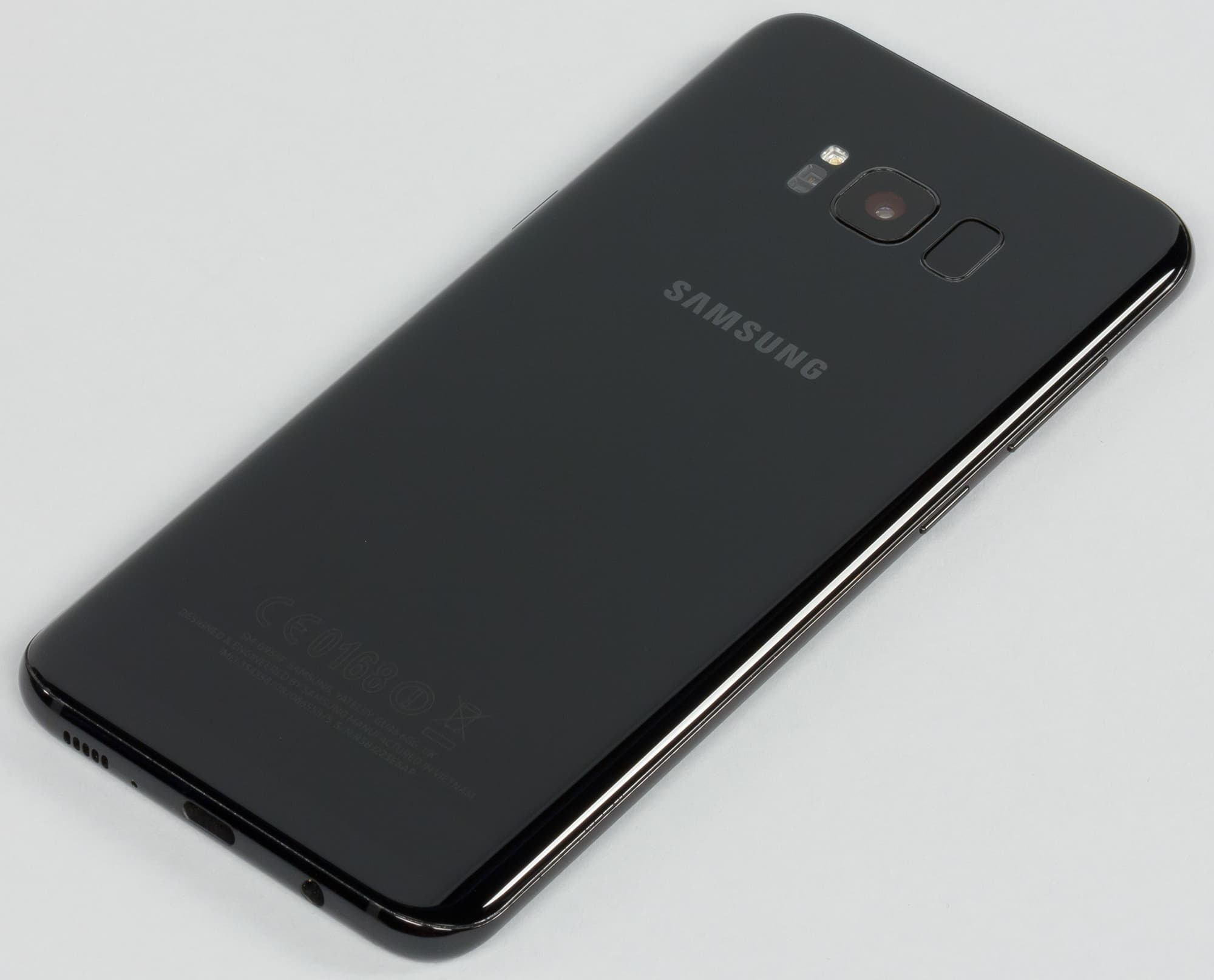 Дизайн Samsung Galaxy S8/S8+ получился необычным и привлекательным. Обтекаемый корпус полностью выполнен из металла и стекла, пластика здесь нет. Закругленная со всех сторон металлическая рамка, симметрично сужающаяся по бокам и расширяющаяся на верхнем и нижнем торцах, соединяет две стеклянных панели — переднюю и заднюю. В качестве покрытия использовано стекло Gorilla Glass 5, стекла имеют заметные закругления по бокам. Рамка в передней плоскости экрана полностью скрывается за изгибом стекла, поэтому тут можно говорить об истинно безрамочном варианте.