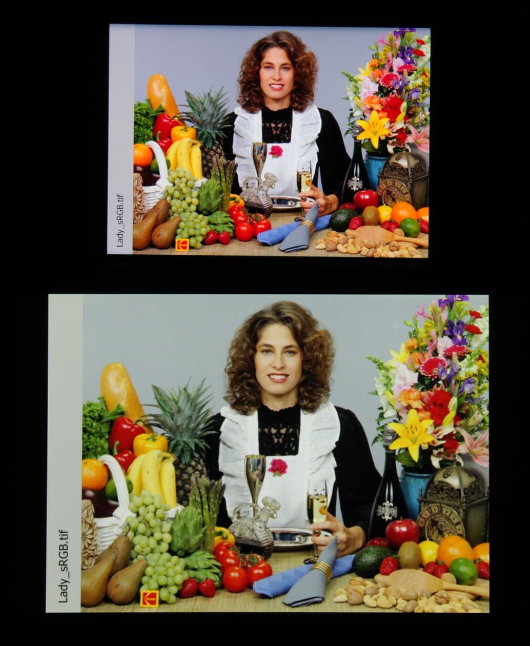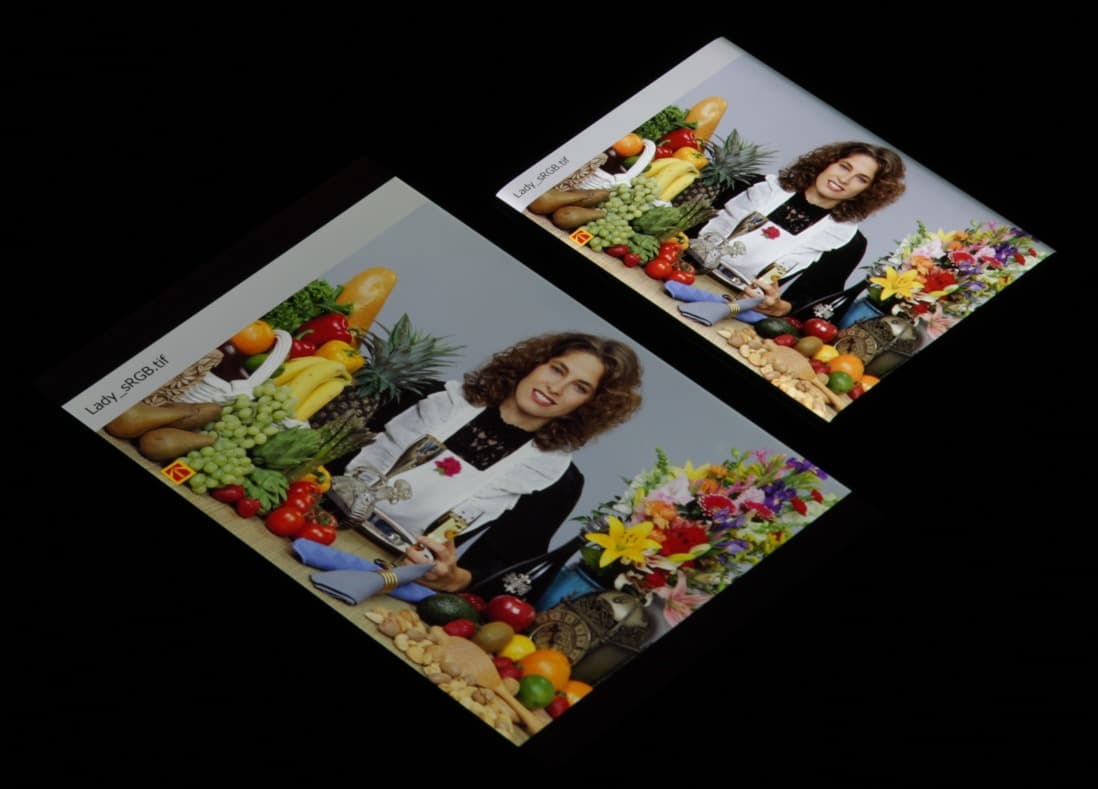 Цветопередача хорошая, цвета в меру насыщенные, цветовой баланс у экранов немного различается. Напомним, что фотография не может служить надежным источником сведений о качестве цветопередачи и приводится только для условной наглядной иллюстрации. В частности, выраженный красноватый оттенок белого и серого полей, присутствующий на фотографиях экрана Samsung Galaxy S8+, при перпендикулярном взгляде визуально отсутствует, что подтверждается аппаратными тестами с помощью спектрофотометра. Причина в том, что спектральная чувствительность матрицы фотоаппарата неточно совпадает с этой характеристикой человеческого зрения. Заметим, что в данном случае картинка занимает в высоту (при этой ориентации экрана) всю доступную для вывода изображения область и заходит на загнутые края экрана, что приводит к затемнению и искажению цвета. Также на свету эти области почти всегда бликуют, что еще больше мешает при просмотре изображений, выведенных на весь экран. И даже картинка фильмов с соотношением сторон 16:9 заходит на загибы, что сильно мешает при просмотре кино.