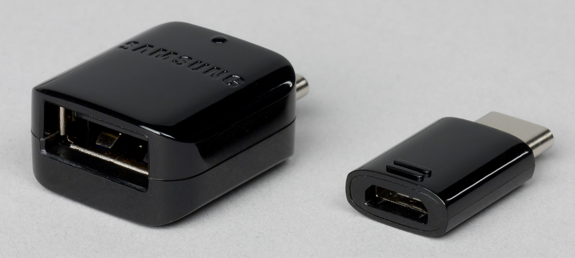 Комплект, в лучших традициях Samsung, оказался обширным. В комплектацию смартфона входит соединительный кабель USB Type-C, сетевой адаптер с варьируемым выходным током и напряжением 5/9 В 1,67/2 А, ключик необычной формы для извлечения карт, переходник Micro-USB — USB Type-C, второй переходник USB — USB Type-C.
