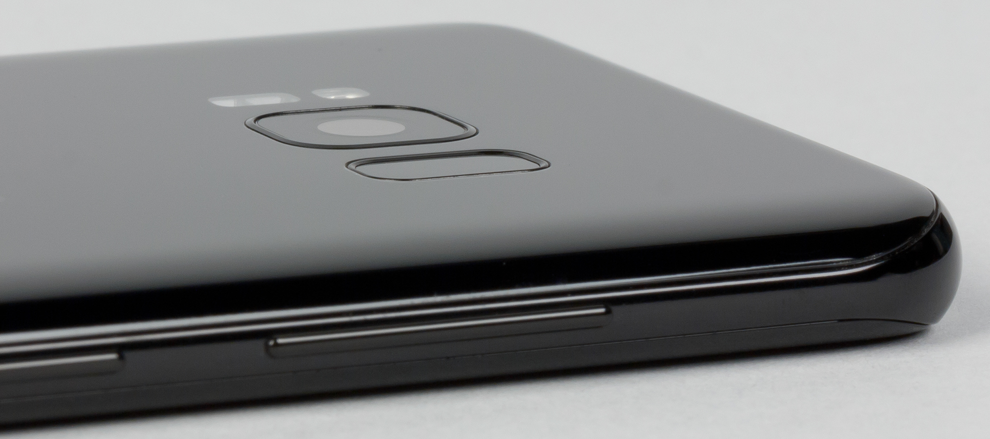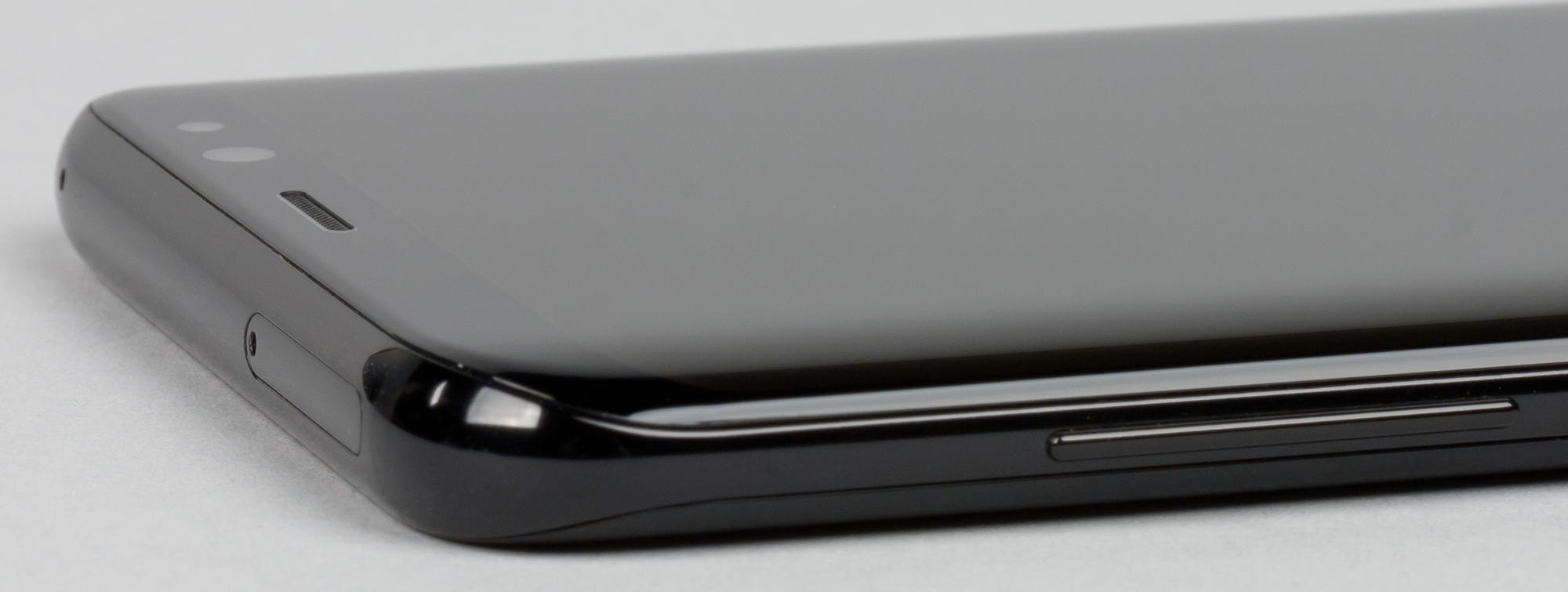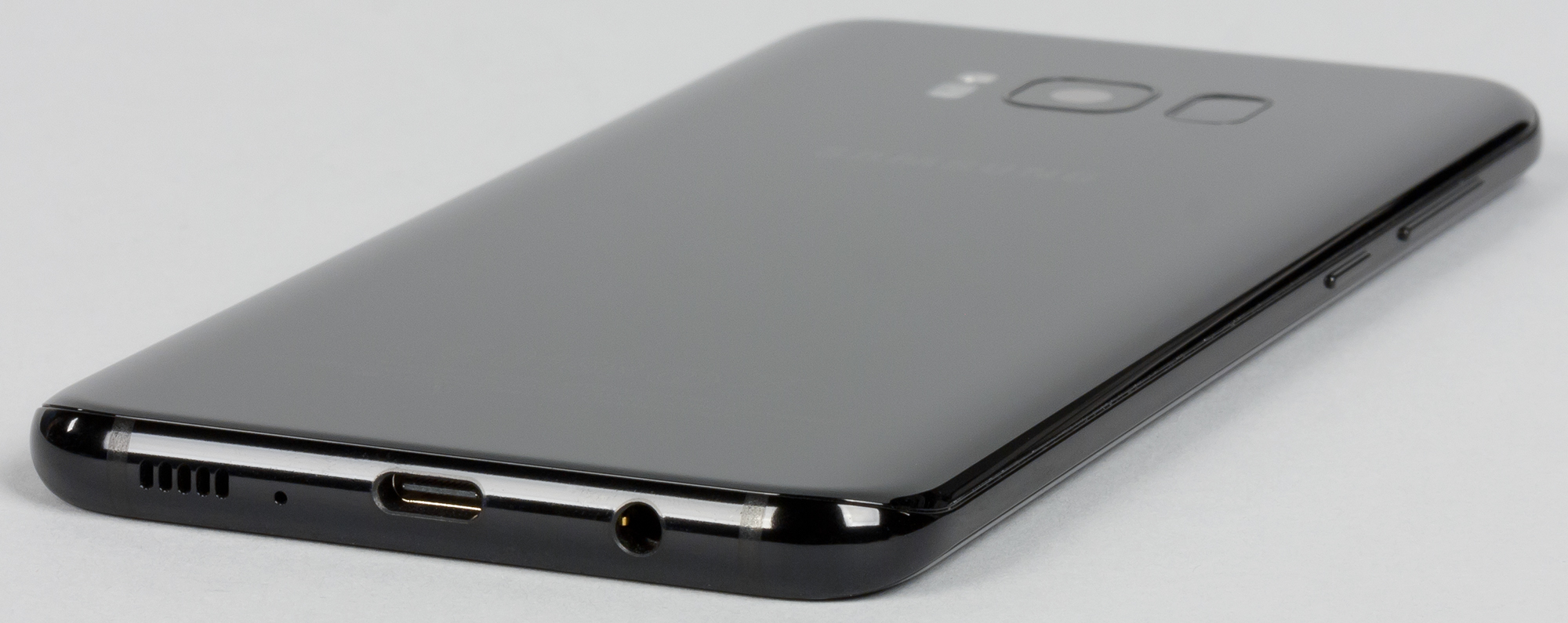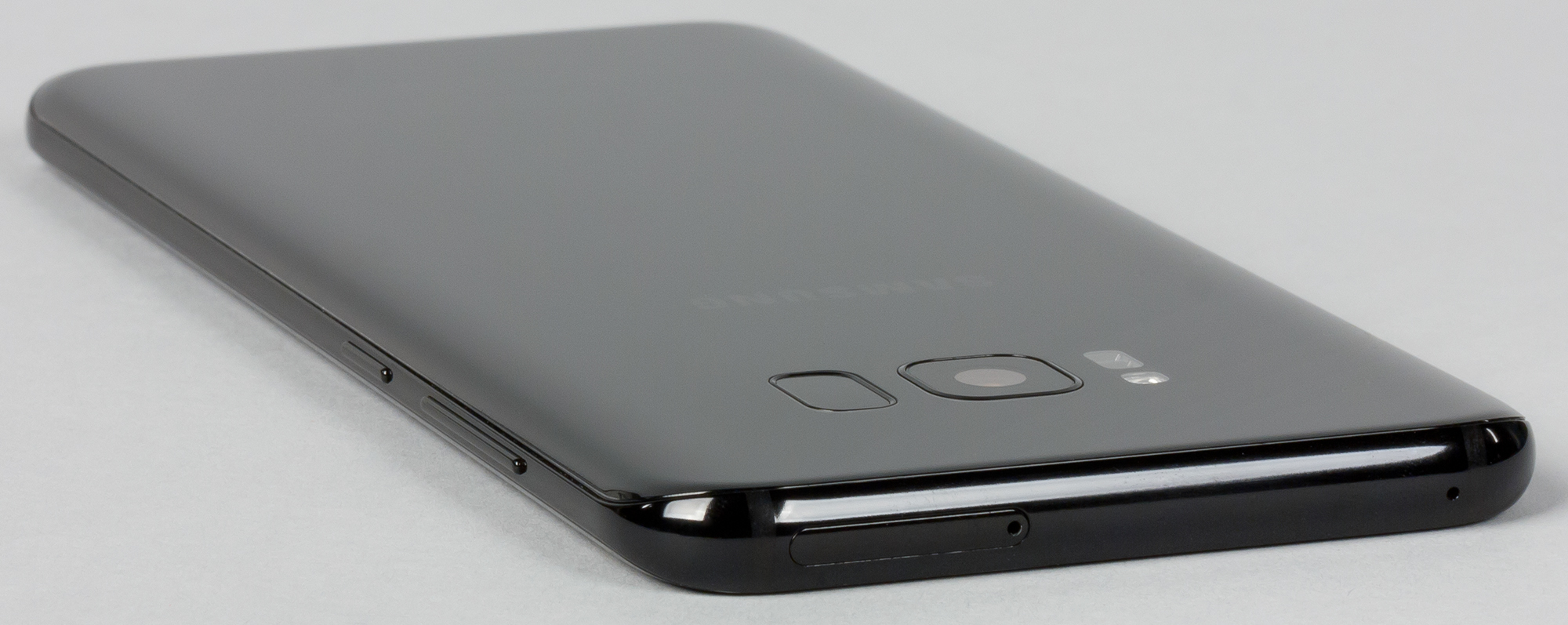 Корпус у Samsung Galaxy S8+ абсолютно симметричен, тыльная сторона также полностью покрыта стеклом Gorilla Glass 5 с загнутыми краями. Края стекол закругляются настолько сильно, что практически бесшовно (не считая рамки) переходят одно в другое, создавая законченную форму без единого острого угла и прямой грани. За такую форму маркетологи Samsung окрестили свое новое детище «смартфоном без границ».