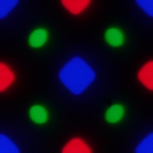 В этом экране используется матрица Super AMOLED — активная матрица на органических светодиодах. Полноцветное изображение создается с помощью субпикселей трех цветов — красного (R), зеленого (G) и синего (B), но зеленых субпикселей в два раза больше, что можно обозначить как RGBG. Это подтверждается фрагментом микрофотографии:
