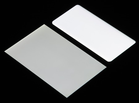 Лицевая поверхность экрана выполнена в виде стеклянной пластины с зеркально-гладкой поверхностью, устойчивой к появлению царапин. Судя по отражению объектов, антибликовые свойства экрана лучше, чем у экрана Google Nexus 7 (2013) (далее просто Nexus 7). Для наглядности приведем фотографию, на которой в выключенных экранах отражается белая поверхность (слева — Nexus 7, справа — Samsung Galaxy S8+, далее их можно различать по размеру):