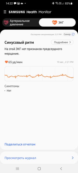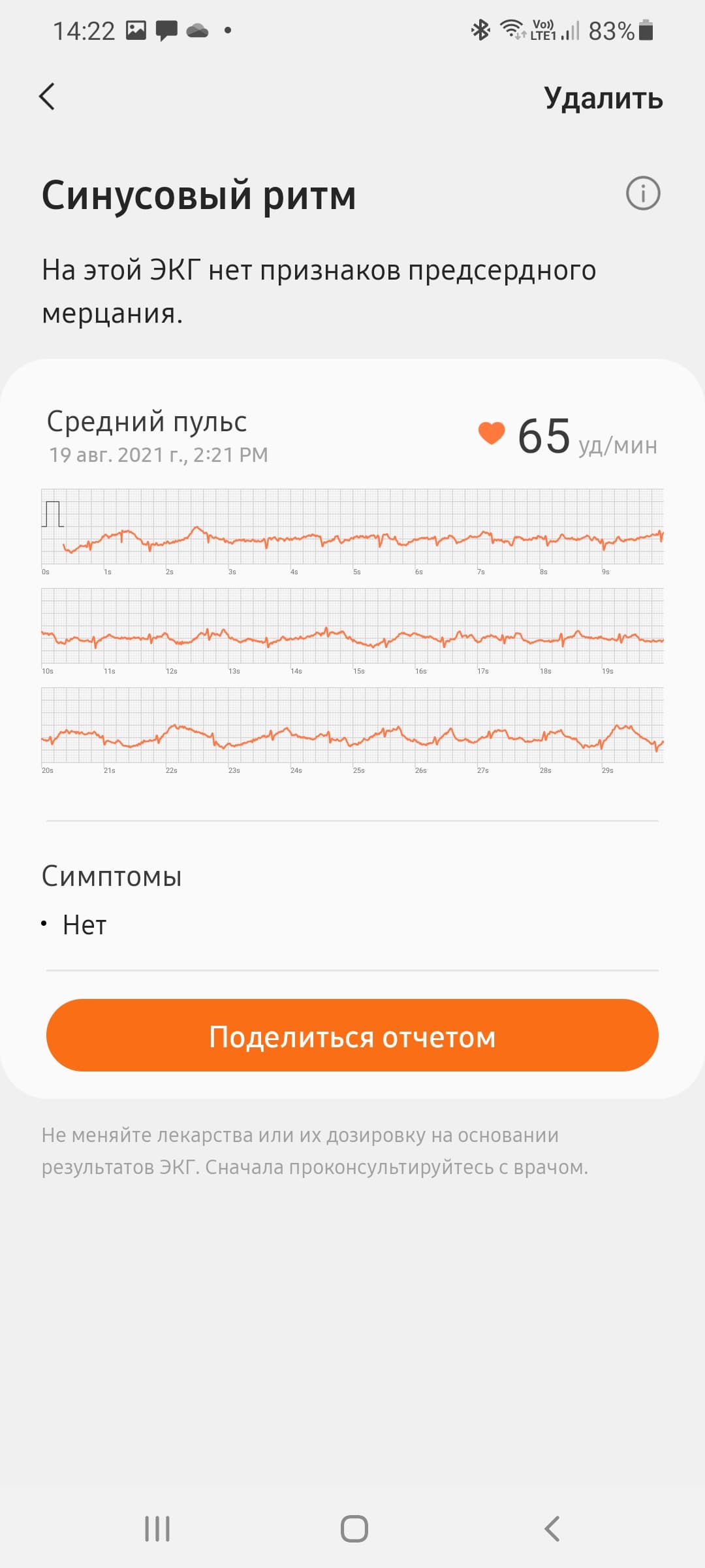Другая важная медицинская возможность Samsung Galaxy Watch4 — построение ЭКГ. Здесь уже калибровка не требуется, а палец надо прикладывать только один. В итоге будет построена кардиограмма, но часы неоднократно предупреждают: эта функция не подходит для определения сердечного приступа. Да и вообще единственное ее целевое предназначение — определение мерцательной аритмии.