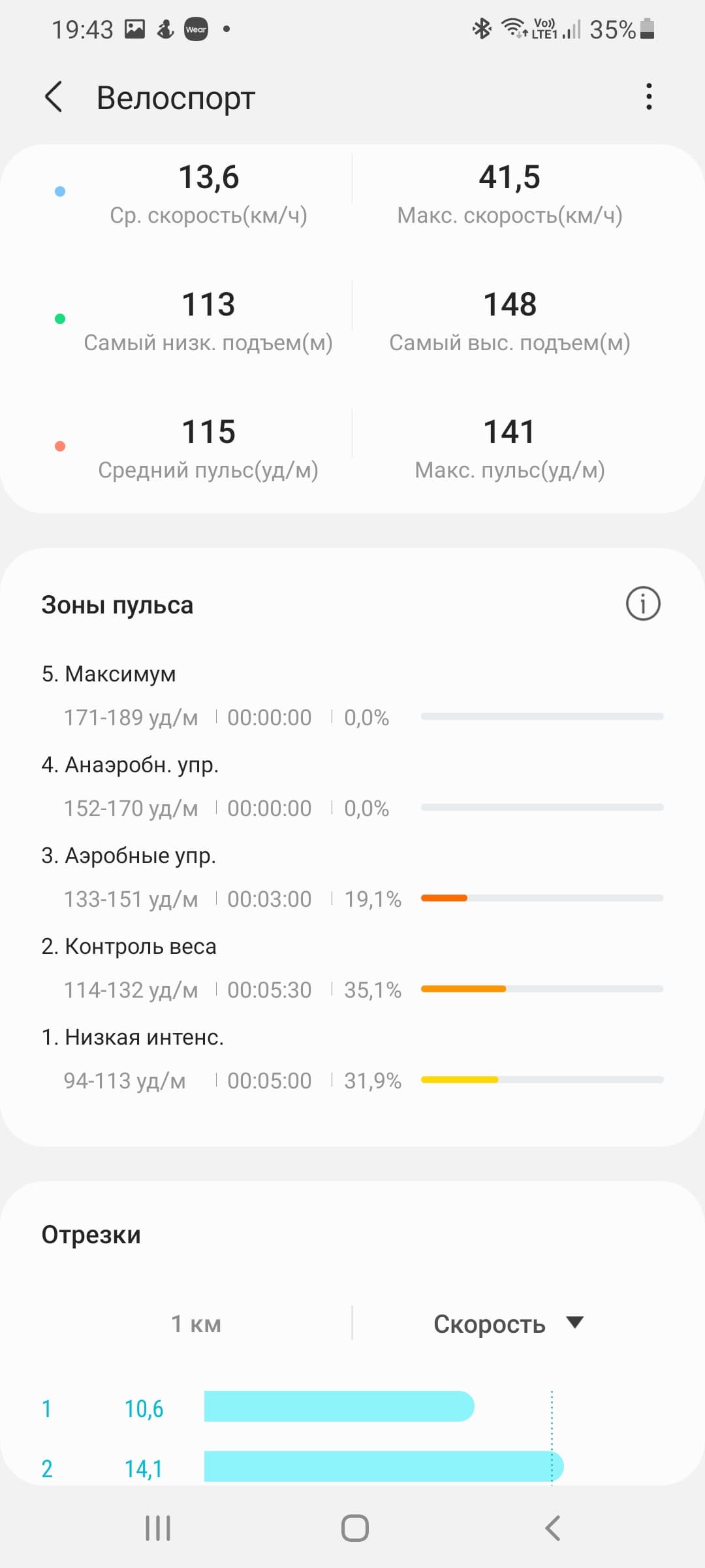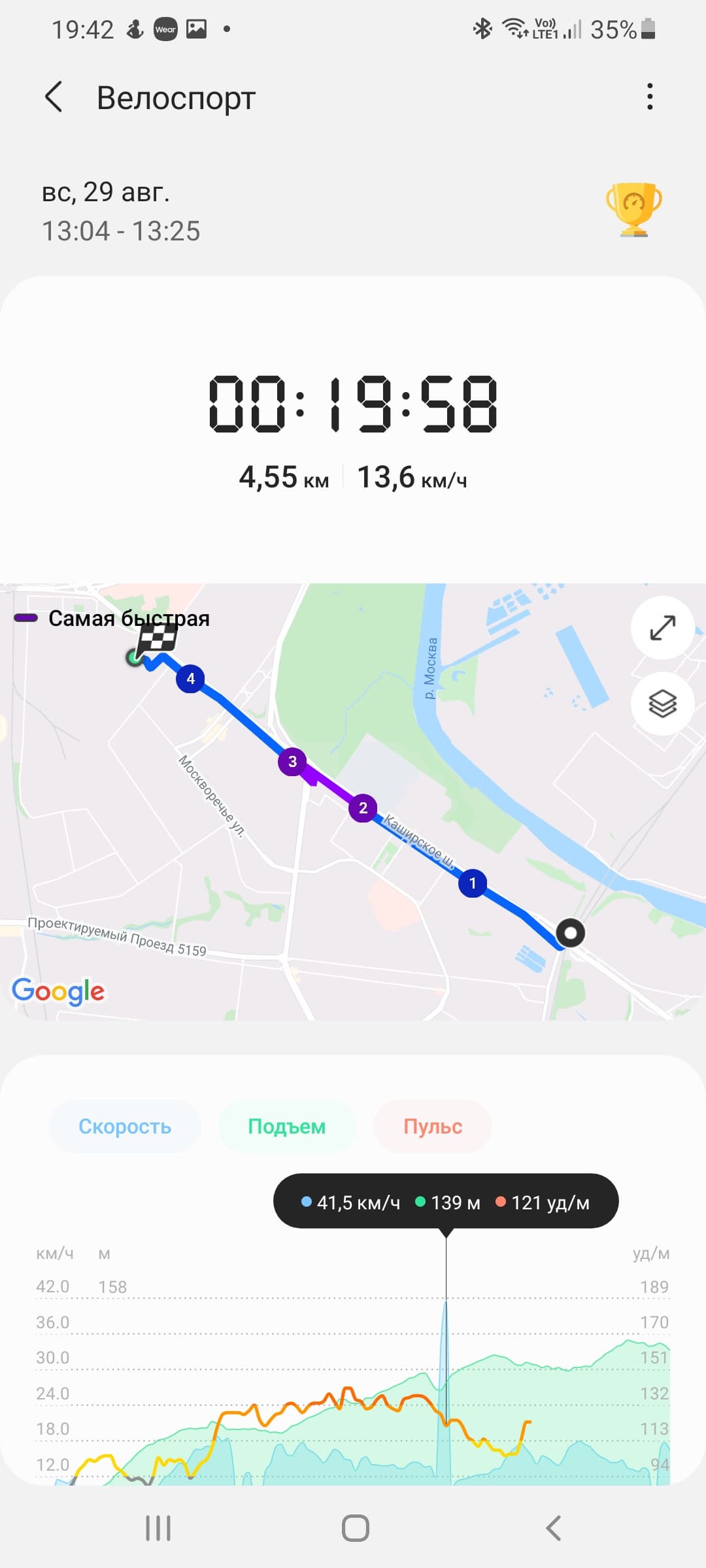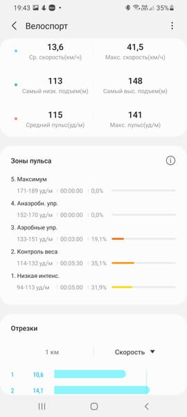 Выше — скриншоты езды на велосипеде. Обратим внимание, что во время самой поездки часы не были подсоединены к смартфону, то есть работали полностью автономно. Но вот что у нас вызвало вопросы, так это указанная максимальная скорость 41,5 км/ч. Даже для спуска с горки это многовато (поездка была просто по городу и без каких-то особых спортивных усилий).