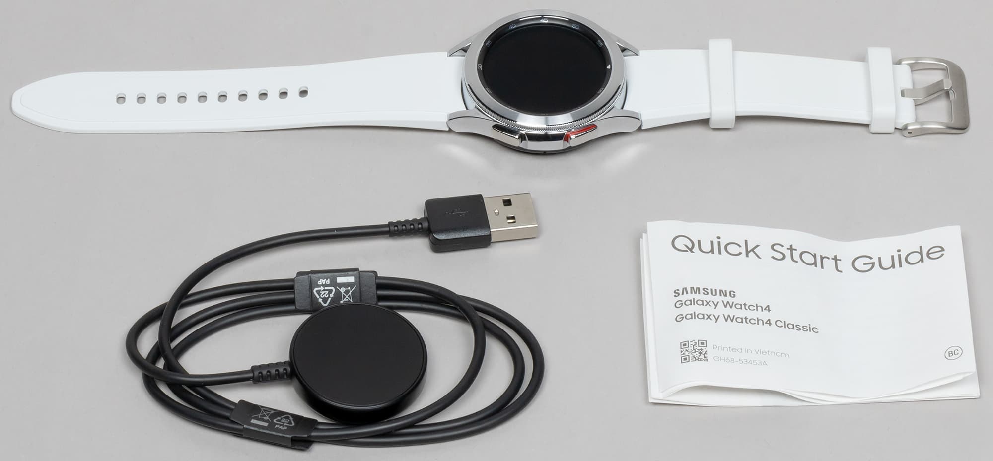 Внутри, помимо самих часов, только USB-кабель с беспроводной таблеткой-зарядкой на конце и листовка. Точно такая же комплектация была и у Samsung Galaxy Watch3.