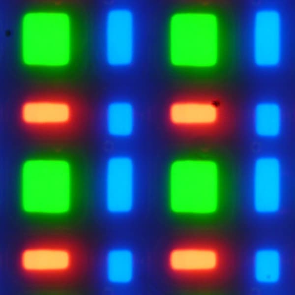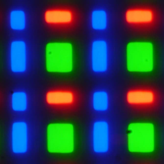 В этом экране используется матрица Super AMOLED — активная матрица на органических светодиодах. Полноцветное изображение создается с помощью субпикселей трех цветов — красного (R), зеленого (G) и синего (B) в равном количестве, что подтверждается фрагментом микрофотографии (две части синего субпикселя работают синхронно):