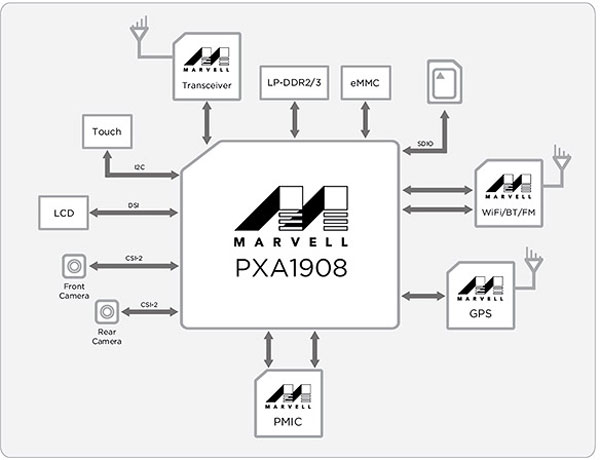 - SoC Marvell Armada PXA1908, 1,2 ГГц, 4 ядра ARM Cortex-A53
