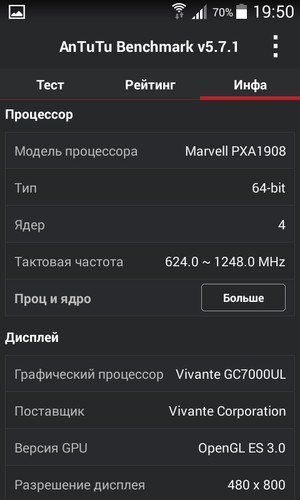 По итогам тестирования производительность бюджетной платформы Marvell PXA1908 ожидаемо оказалась на одном уровне с похожей по строению и позиционированию Qualcomm Snapdragon 410. Жаль только, что установленная здесь устаревшая 32-разрядная версия Android ОС 4.4 не позволяет в полной мере раскрыть весь потенциал 64-битной аппаратной начинки. Впрочем, есть надежда, что смартфон получит обновление до пятой версии Android.
