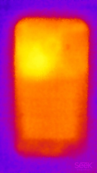Видно, что нагрев локализован в верхней правой части аппарата, что, видимо, соответствует расположению микросхемы SoC. Ниже просматриваются контуры аккумулятора, который тоже нагревается при интенсивном разряде. По данным теплокамеры, максимальный нагрев составил 38 градусов (при температуре окружающего воздуха в 24 градуса), это не очень много.