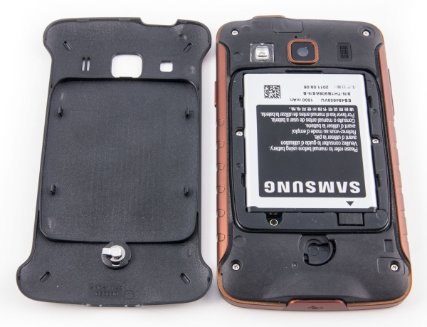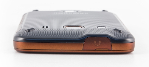 В целом корпус Samsung Galaxy Xcover выглядит очень надежным, детали подогнаны друг к другу плотно и собраны крепко — ничего не скрипит и не люфтит при скручивании и сдавливании. Благодаря матовой поверхности корпуса, ребристой шершавой задней крышке и боковым насечкам вдоль вертикальных граней в руке телефон удерживается чрезвычайно надежно и вряд ли может выскользнуть даже из мокрых пальцев. Очевидно, что защищенный телефон для экстремалов и должен быть таким.