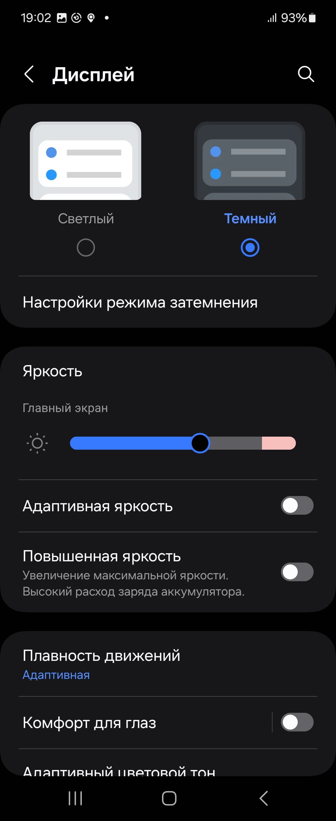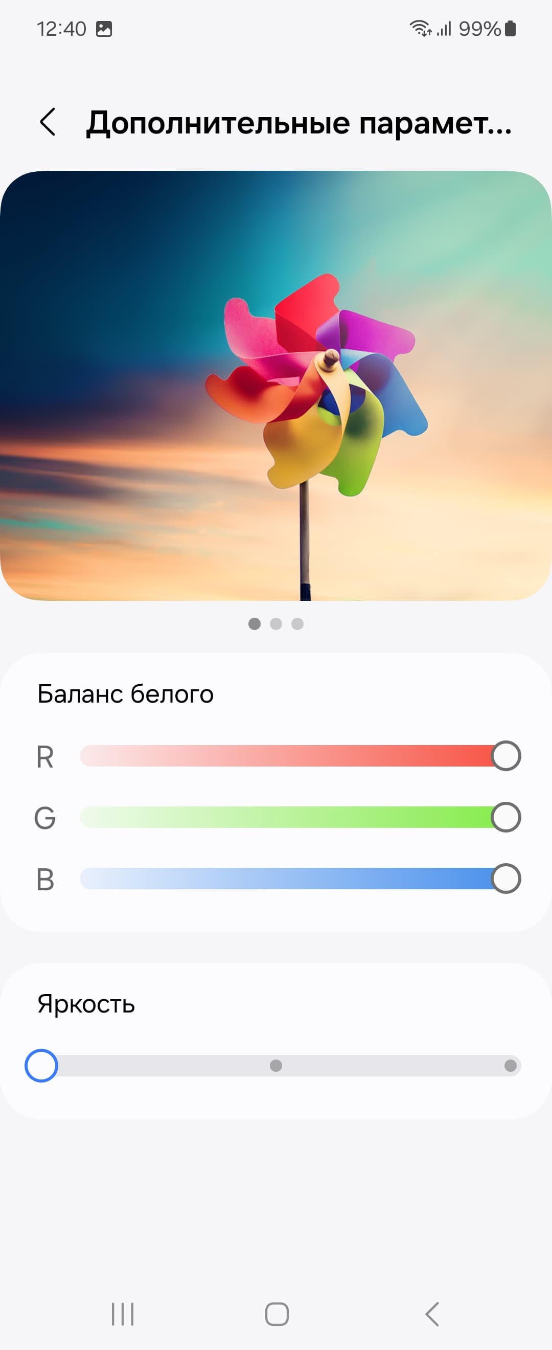 Присутствует функция Адаптивный цветовой тон (АЦТ), которая, если ее включить, подстраивает цветовой баланс под условия окружающей среды. Используются данные с камеры. Мы включили эту функцию и проверили, как она работает (профиль Естественные цвета, основной экран):