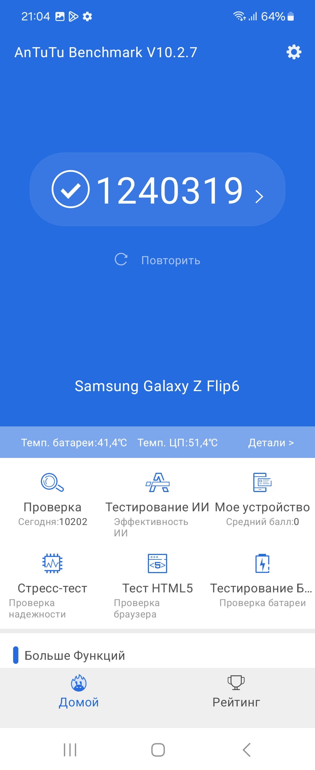 | AnTuTu (v10.x) (больше — лучше) | 1240319 | 1297546 | 792657 | 1033512 | 620852 |