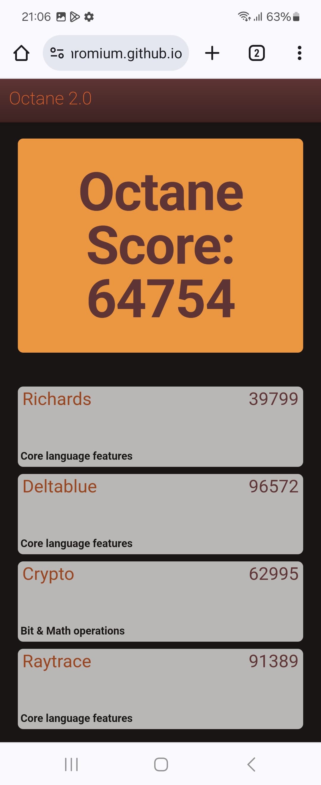 | Google Octane 2 (больше — лучше) | 64754 | 19467 | 24106 | 52617 | 7230 |