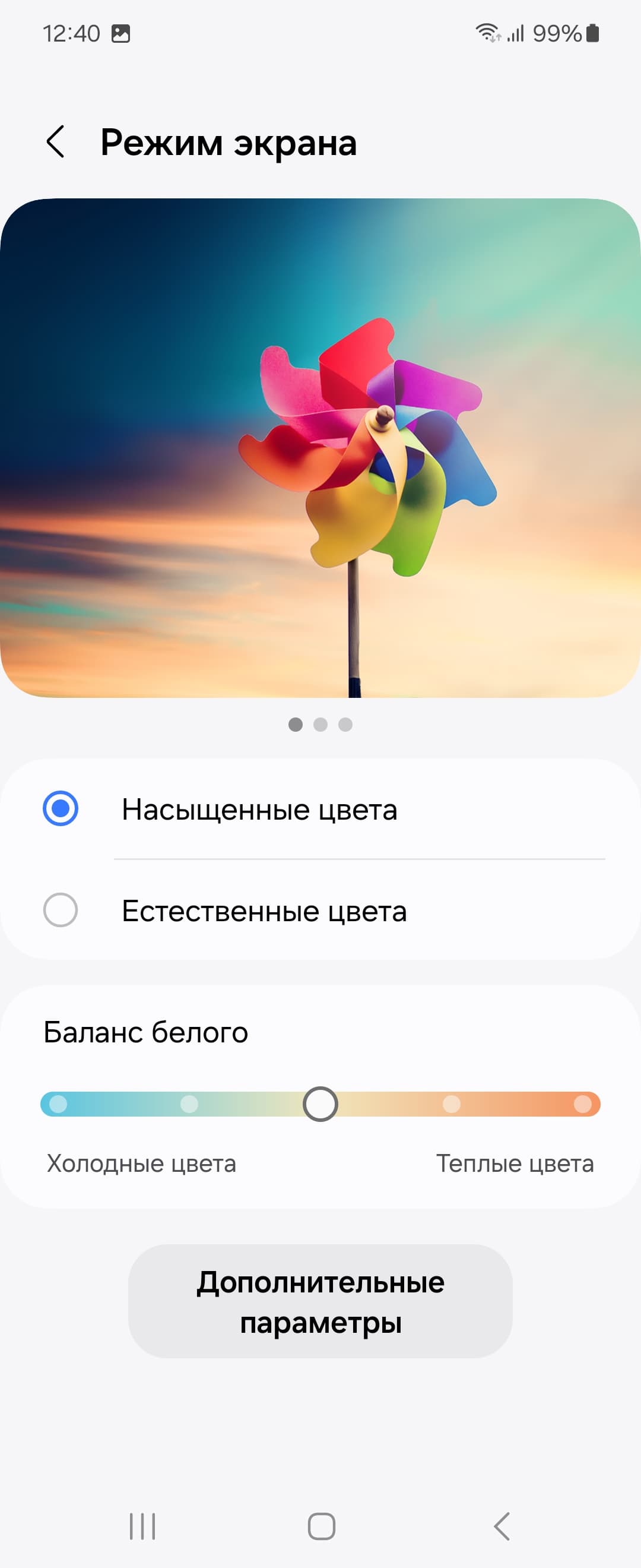 Почему-то только при выборе профиля Насыщенные цвета появляется возможность настройки цветового баланса регулировкой цветовой температуры и тремя регулировками интенсивности основных цветов, но из-за слишком широкого цветового охвата как раз в этом профиле нет смысла исправлять именно баланс.