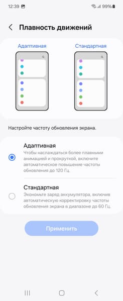В настройках для основного экрана можно включить режим с повышенной до 120 Гц частотой обновления. В этом режиме как минимум увеличивается плавность прокрутки списков в меню.