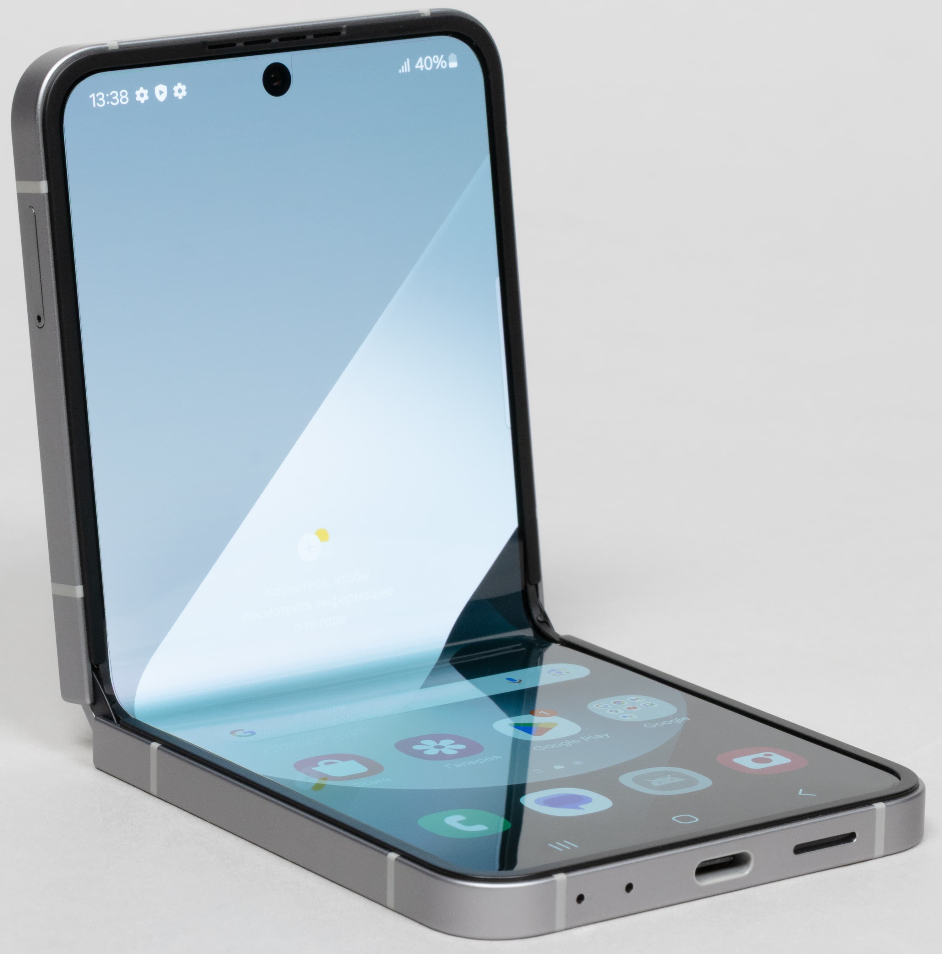 В разложенном состоянии смартфон с виду напоминает обычный моноблок, но на практике разница ощутима: у него более вытянутый и узкий экран. В строчку по ширине влезает меньше текста, картинки отображаются более мелко. Из-за этих узких экранов не всем нравится использовать раскладные смартфоны — что горизонтальные, что вертикальные в закрытом состоянии (у тех внешний экран тоже более узкий, чем у обычных моноблоков).