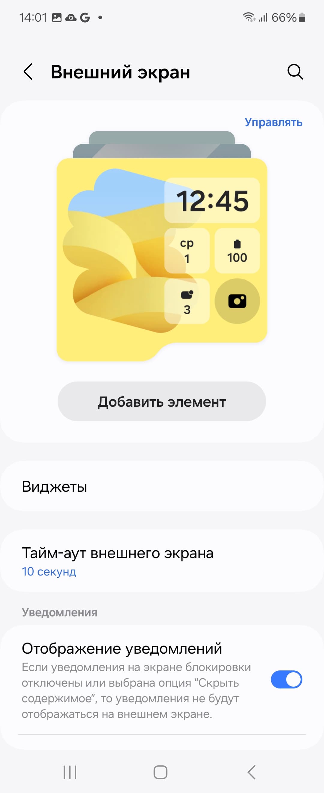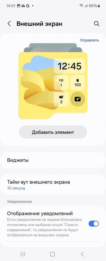 Что касается внешнего экрана, он поддерживает вывод лишь некоторого ограниченного набора виджетов, хотя и настраиваемых. Произвольное приложение на нем не запустишь. Правда, есть «лайфхак»: через приложение Fine Lock можно добавить плагин Good Lock, который как раз позволяет выводить на внешний экран любые приложения. Стандартный же набор включает анимированные заставки, информацию о погоде, уведомления, календарь и т. п.