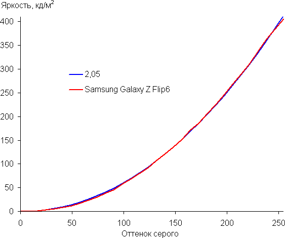 Напомним, что в случае OLED-экранов яркость фрагментов изображения динамично меняется в соответствии с характером выводимого изображения — уменьшается для светлых в целом изображений. В итоге полученная зависимость яркости от оттенка (гамма-кривая), скорее всего, немного не соответствует гамма-кривой статичного изображения, так как измерения проводились при последовательном выводе оттенков серого почти на весь экран.