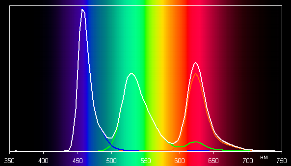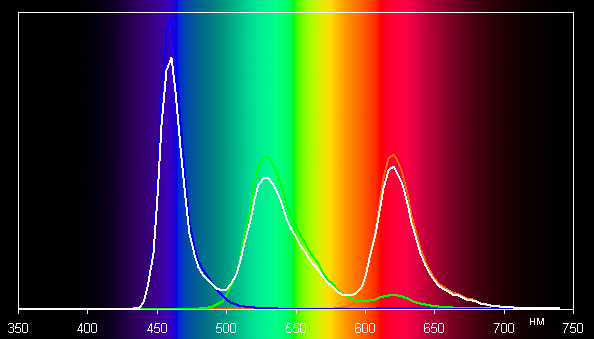 Без коррекции (профиль Насыщенные цвета) спектры компонент хорошо разделены (хотя какое-то подмешивание зеленого к красному есть):