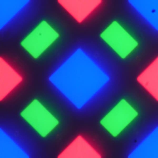 В обоих экранах используется матрица Super AMOLED — активная матрица на органических светодиодах. Полноцветное изображение создается с помощью субпикселей трех цветов — красного (R), зеленого (G) и синего (B), но красных и синих субпикселей в два раза меньше, что можно обозначить как RGBG. Это подтверждается фрагментом микрофотографии: