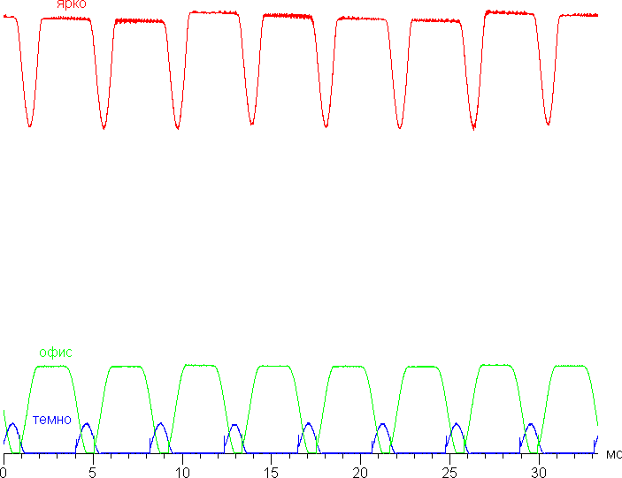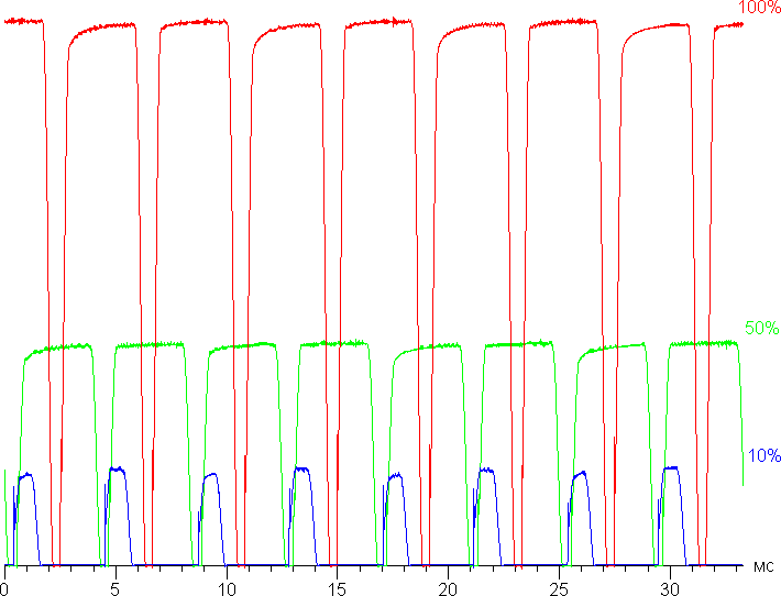 На любом уровне яркости присутствует значимая модуляция с частотой 240 Гц. На рисунке ниже приведены зависимости яркости (вертикальная ось) от времени (горизонтальная ось) для нескольких значений настройки яркости:
