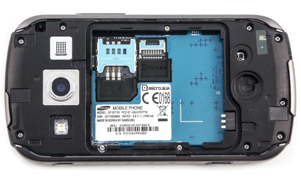 В этой защищенной от попадания влаги части расположены слоты для карты памяти, SIM-карты и аккумуляторной батареи. Обе карты вдвигаются в свои пазы и прижимаются сверху аккумулятором, так что горячую замену здесь произвести никак не удастся.