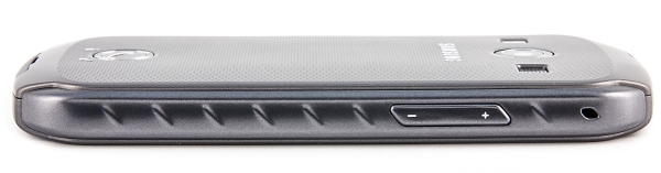 Остальные элементы управления и разъемы расположились, как обычно, на гранях устройства. Качелька регулировки громкости и клавиша питания/блокировки — на боковых гранях. Отдельная фотокнопка здесь тоже, кстати, имеется. Все клавиши Samsung Galaxy Xcover 2 крупные, имеют мягкий, глубокий ход и отчетливый отклик. Нажимаются легко и легко находятся наощупь.