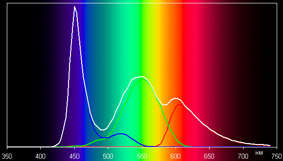 Впрочем, отклонения координат основных цветов от вершин sRGB не очень большие, поэтому визуально цвета на этом экране имеют естественную насыщенность. Спектры показывают, что светофильтры матрицы в умеренной степени подмешивают компоненты друг к другу: